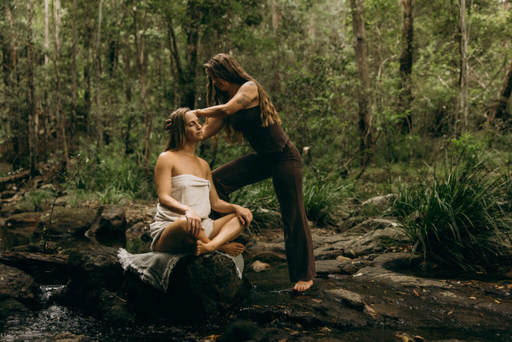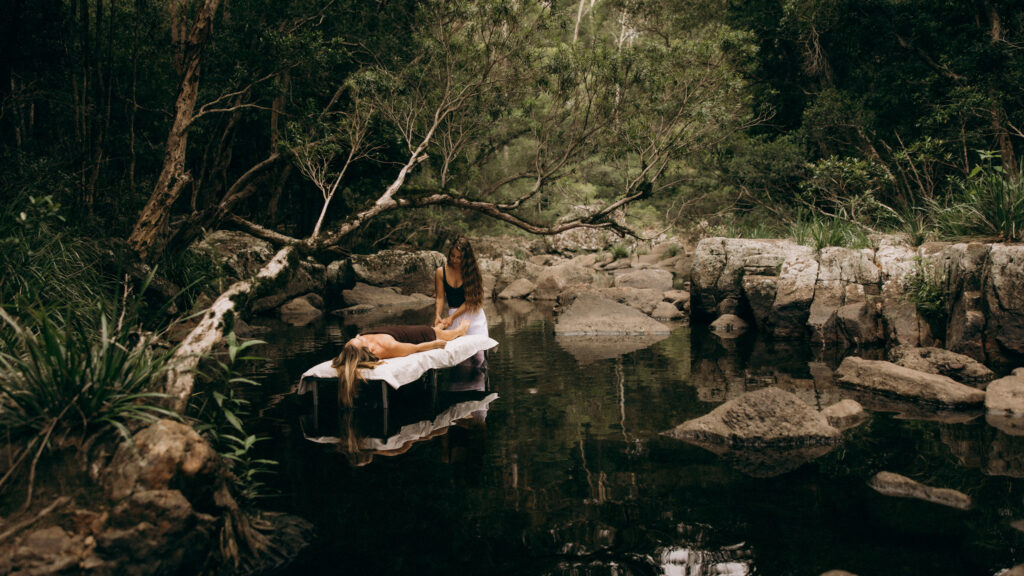 We went to a hidden creek spot in the Noosa hinterland instead of a studio. Leaned into the raw beauty of moss-covered rocks and dappled light instead of perfect styling. Captured her actually doing the work: massage therapy by the water, ritual practices with smoke and crystals, stillness.